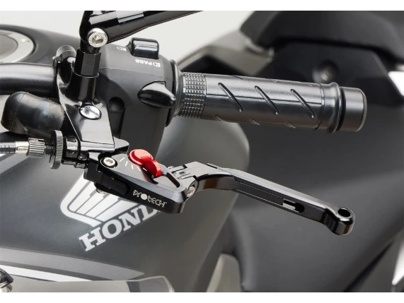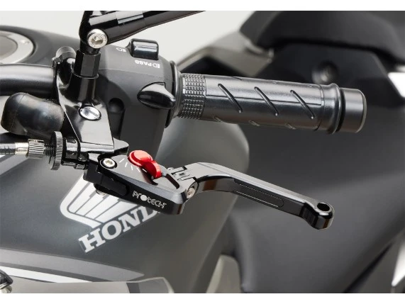 Der superleichte PROTECH Bremshebel Race bietet eine Vielzahl an Verstell Möglichkeiten und besticht durch sein sportlich, aggressives Design. Der aus 6061-T6-Aluminium im Vollfräsverfahren hergestellte Hebel ist extrem stabil und leicht. Der Abstand zum Lenker lässt sich auch während der Fahrt 6-fach verstellen. Die Hebellänge ist stufenlos einstellbar (2 bis 4 Finger). Außerdem ist der PROTECH Bremshebel Race klappbar, sodass er auch bei Stürzen mit einer hohen Wahrscheinlichkeit funktionsfähig bleibt. Montagefertig inklusive Adapter. Mit ABE.