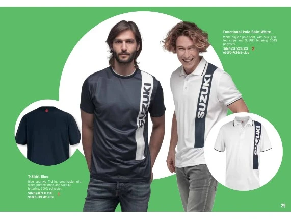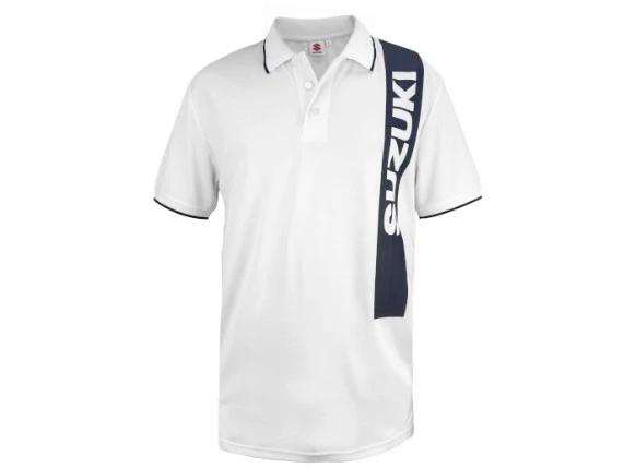 Polo-Shirt in weiß mit einem blauen Streifen und Suzuki-Schriftzug.