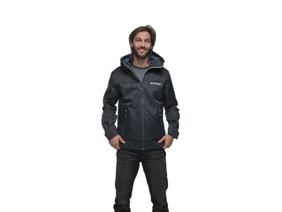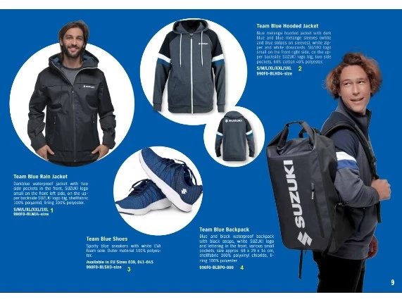 Dunkelblaue Regenjacke mit Kapuze sowie zwei Seitentaschen und einem kleinen Suzuki-Logo auf der Vorderseite. Großes Suzuki-Logo auf dem Rücken.