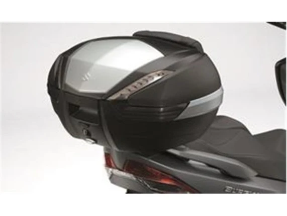 47 Liter, Schwarz mit silbern eloxierter Aluminium Abdeckung und getönten Reflektoren.